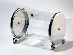 Portacialde / Portacucchiaini in Plexiglass con fianchi in Metallo, divisorio asportabile e antina di chiusura. VERSIONE SILVER TRASPARENTE. Elegante e comodo, molto stabile, capiente, pratico sia nel retrobanco che a vista, sopra la vetrina. Portacialde e/o Cucchiaini con fianchi in metallo.