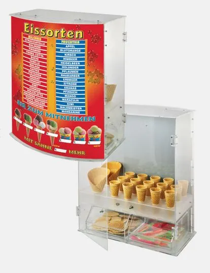 Portaconi in plexiglas trasparente con frontale bombato completo di decorazione luminosa e lastrine mobili per l’esposizione dei gusti: ricordateVi di comunicarci via mail o fax la Vostra lista di gusti perchè le lastrine vengono realizzate appositamente per Voi.