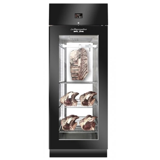 Prodotto realizzato in acciaio plastificato nero, progettato per la frollatura della carne. Tutta la gamma degli armadi per la frollatura sono pensati per garantire un perfetto DRY-AGING ottenendo il miglior risultato per i propri tagli di carne. Dotato di ampia visibilità interna grazie alle vetrate sulla porta e sul retro dell’armadio. Struttura interna in acciaio inox Aisi 304 e interno con spigoli arrotondati e fondo stampato. Cremagliere griglie e guide in acciaio inox AISI 304. Non necessita l’allacciamento alla rete idrica.
