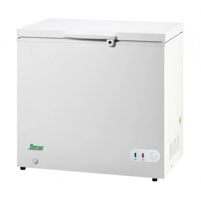 Congelatore a pozzetto con refrigerazione statica, con una struttura esterna in acciaio verniciato bianco ed interna in alluminio goffrato.