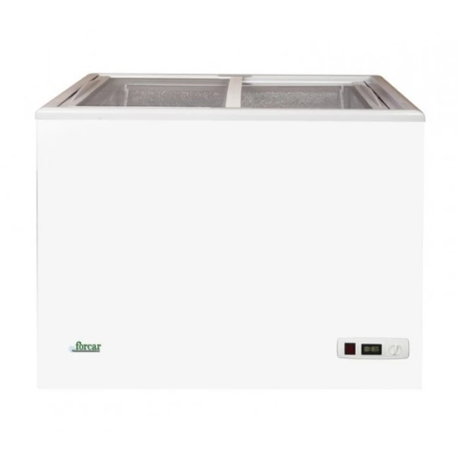 Congelatore a pozzetto con refrigerazione statica, con una struttura esterna in acciaio verniciato bianco ed interna in alluminio goffrato.